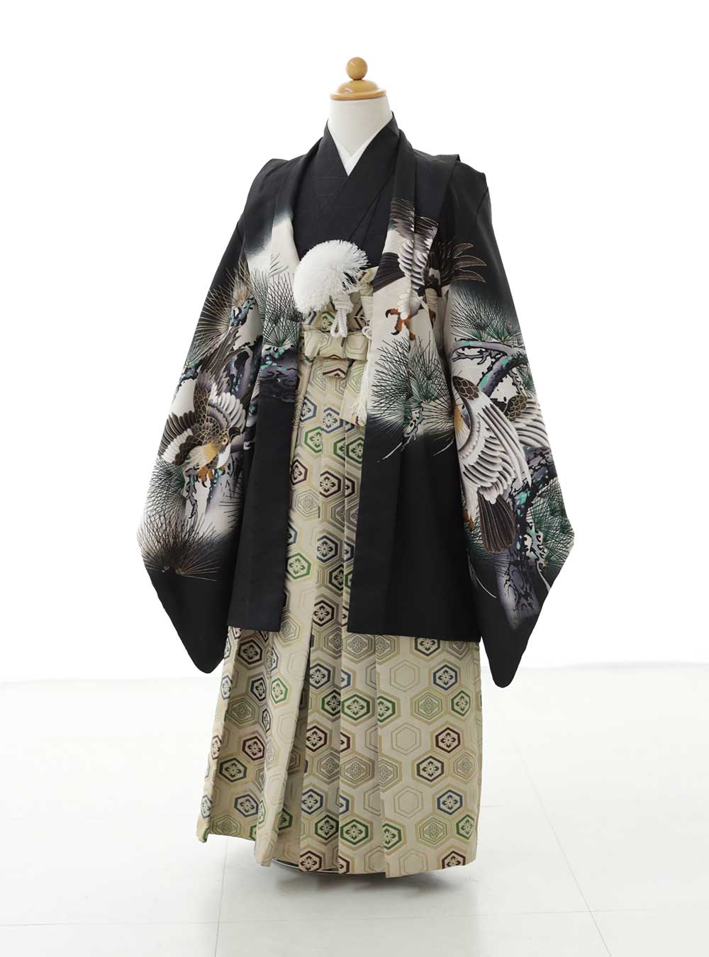 黒地をベースにしており、豪華な柄が施されています。羽織には松や鷹などの伝統的な日本のモチーフが描かれ、厳かな雰囲気を演出しています。着物全体には、力強さと気品を感じさせるデザインで、お子様の晴れの日にふさわしい装いです。 細部まで丁寧に作られており、伝統と美しさをしっかりと表現しています。特別な日を華やかに彩る1着です。