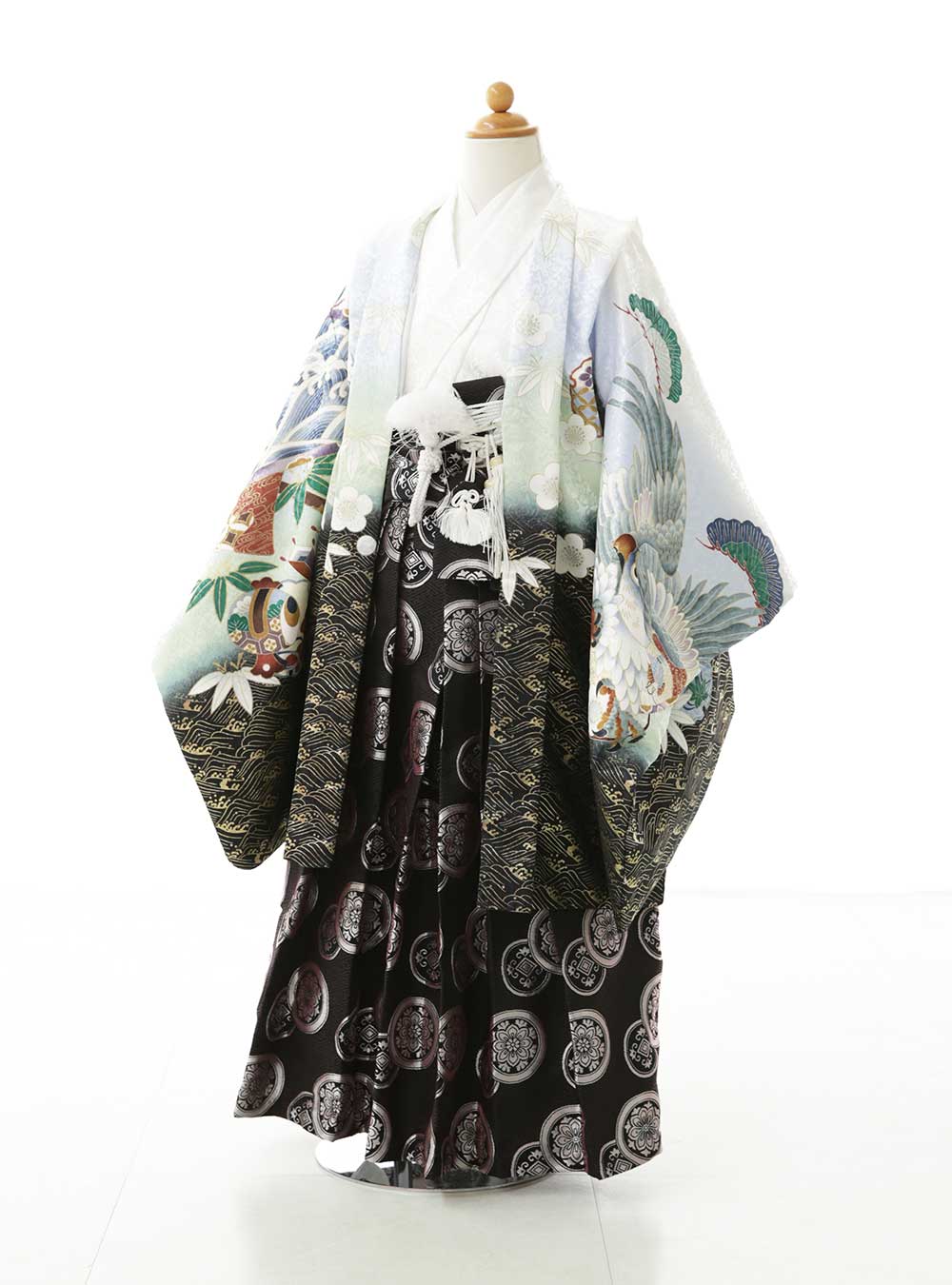 白を基調にした爽やかなデザインが特徴で、薄い水色と薄い黄緑が優しい印象を与え、裾にかけては黒色になっているので、締まって見え男らしさをも演出しています。 肩から袖にかけて大きく描かれた鷹が男の子らしく、冒険心をくすぐります。繊細な模様が全体にあしらわれていて、華やかで魅力的な1着です。