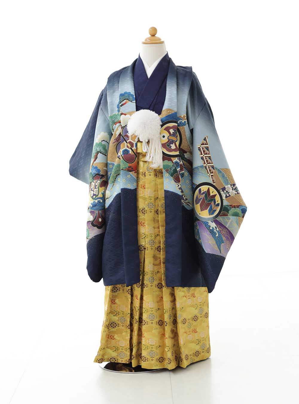 深い青色をベースにしたデザインで、落ち着いた雰囲気を醸し出しています。羽織には、伝統的な武士の道具や自然の風景が鮮やかに描かれており、力強さと歴史を感じさせる1着です。 色合いの美しいグラデーションが、全体に深みと上品さを与えています。細部まで丁寧に仕立てられており、お子様の特別な日をより一層引き立てる着物です。