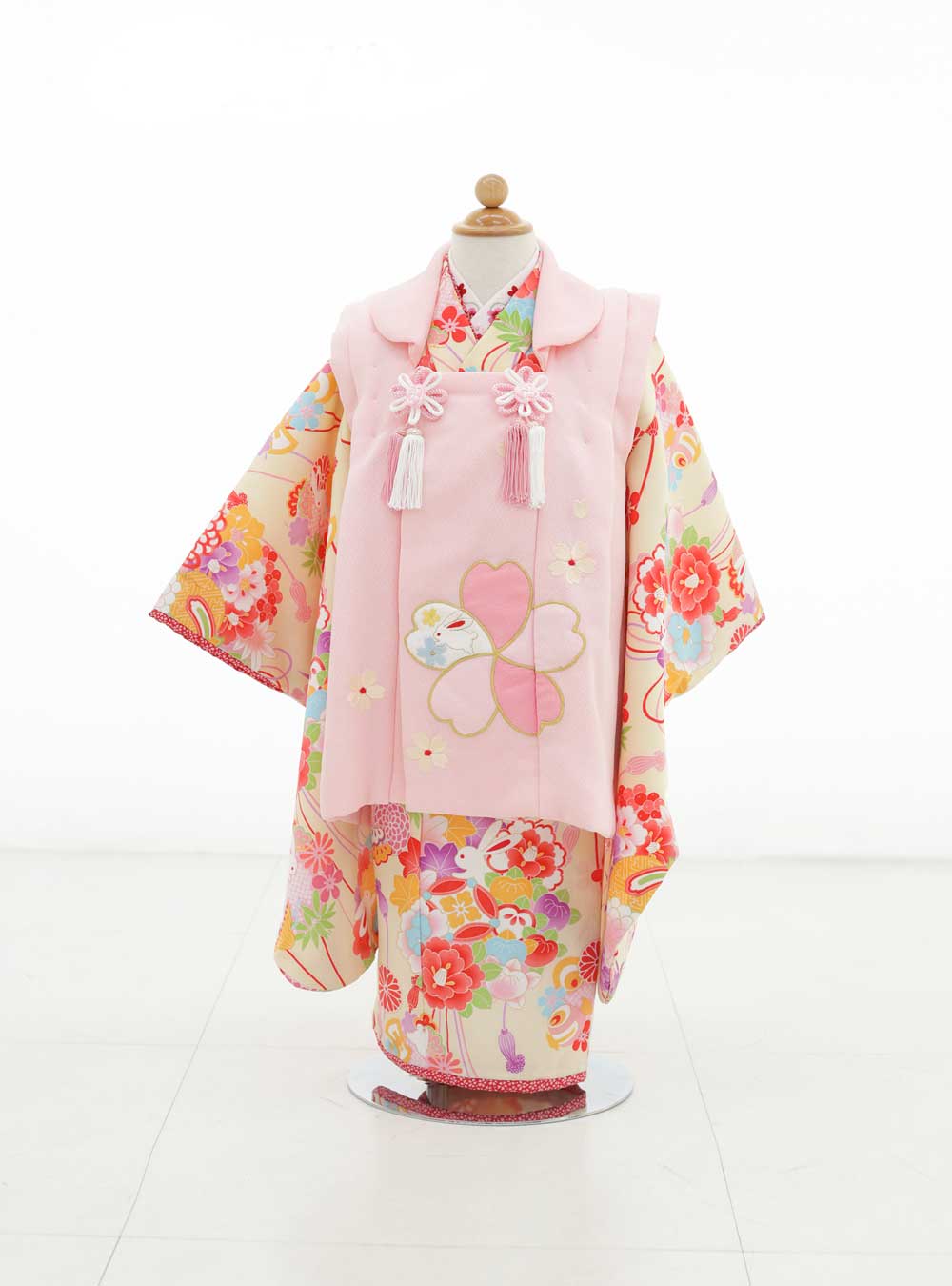 ピンクベースのカラフルな着物。ベージュカラーに赤・水色・オレンジの花々や古典模様が散りばめられており一見派手なデザインに見えますが、被布コートがシンプルなピンク色で全体を落ち着かせています。 被布コートには大きな桜がデザインされ、胸元にもピンクと白の花柄の飾りと房が付いている女の子らしい1着。