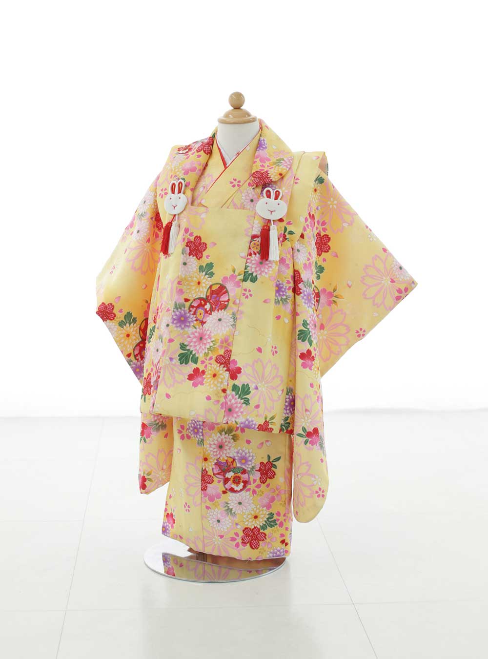 着物も被布コートも同じデザインの着物。明るい黄色地にピンクや赤・緑の菊や桜がデザインされています。菊には「高貴」「高尚」「延命長寿」・桜には「豊かさ」や「繁栄」の意味があり、縁起の良い花々です。 胸元には「跳躍」「飛躍」「子孫繁栄」の意味があるうさぎの飾りがついており、デザインの可愛さがお子様から人気です♪古典柄でどの年代からも好かれる1着。