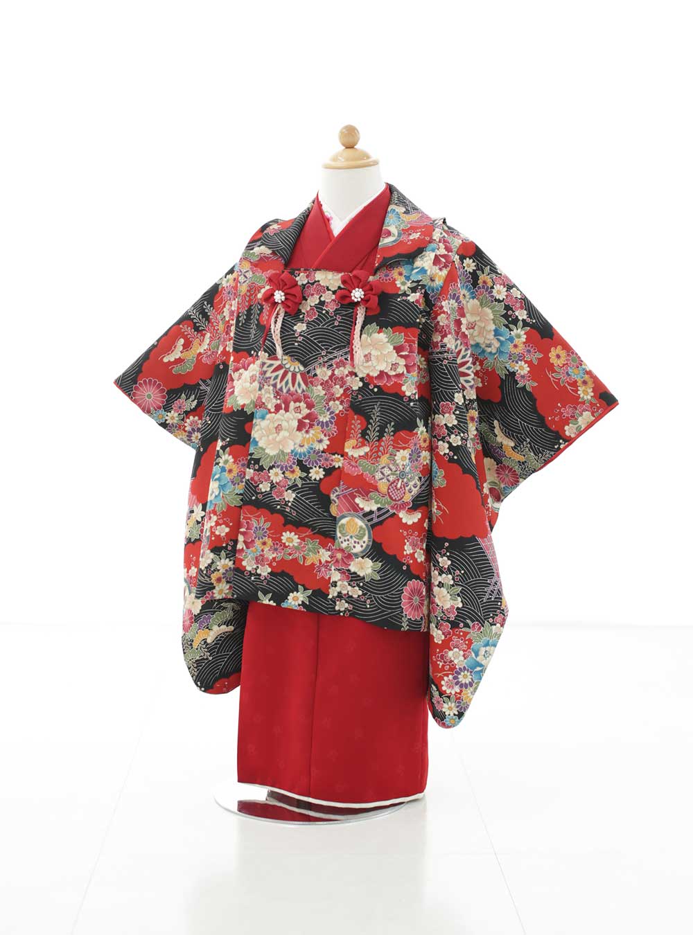 黒と赤のコントラストがかっこいい雰囲気を出す着物。マットな真っ赤の着物の上には、黒や赤でまとめられた被布コートを羽織ります。 黒の流水紋が古典的でシックなデザインで、赤のシンプルな雲柄とくすみカラーの花々や伝統的な模様が施されています。王道の古典着物やかっこいい雰囲気がお好みの方にオススメの1着。