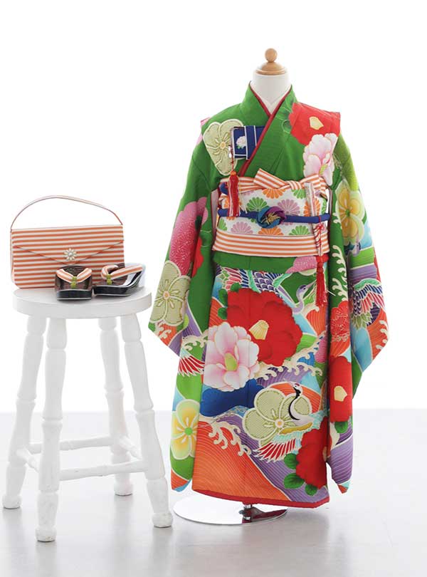 鮮やかな緑をベースに、色とりどりの大輪の花々が描かれたこの着物は、エネルギッシュで明るい印象を与えます。特に赤とピンクの椿が目をひき、そこによりそった鶴は縁起が良い着物です。 濃い色味で元気いっぱいの雰囲気を演出しています。大胆なデザインが視線を引きつけ、お子様の個性をより一層際立たせるでしょう。