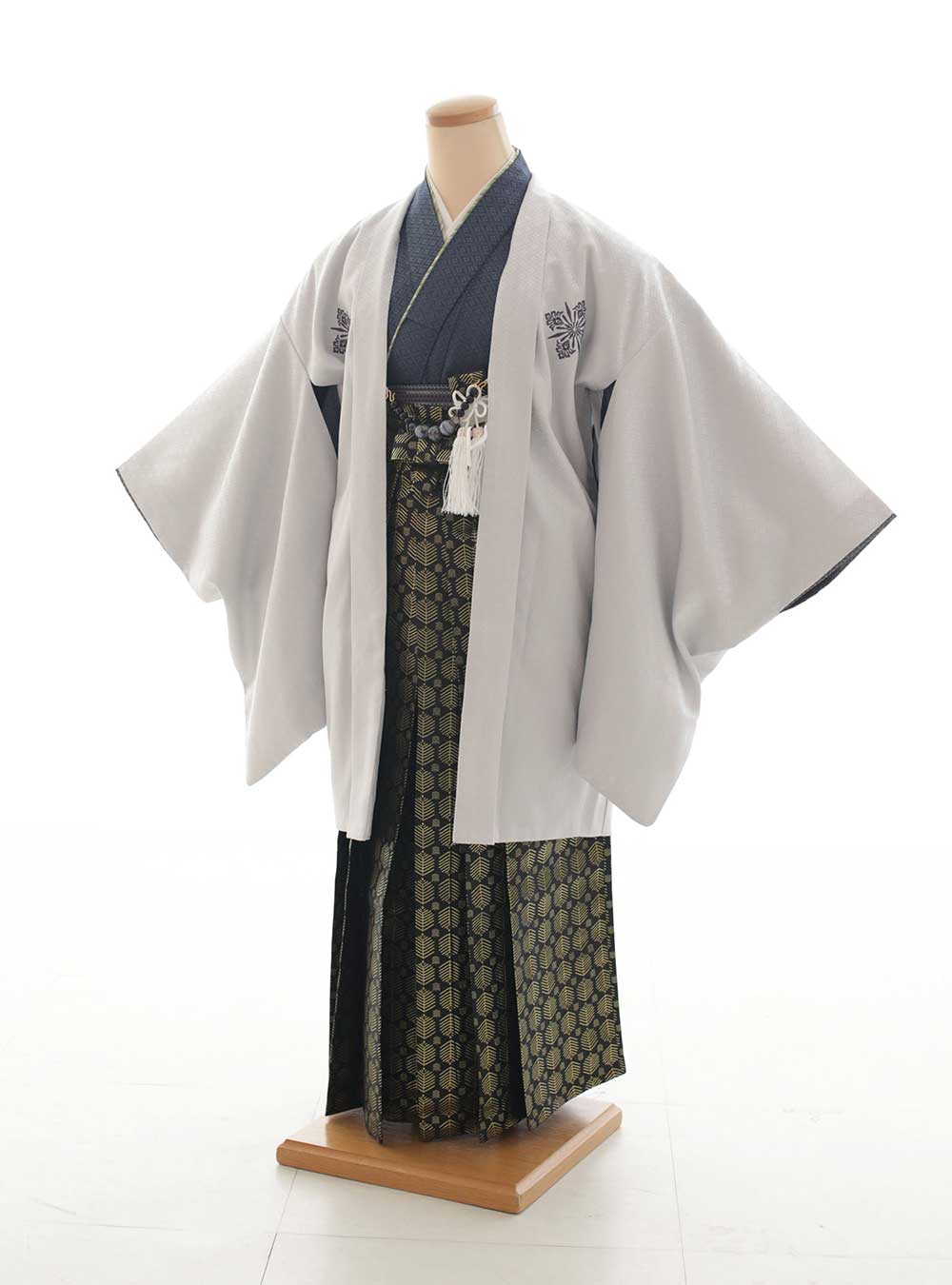 羽織は淡いグレーでシンプルながらも、胸の大きく入った紋が高級感を感じさせるのが特徴。中の着物は落ち着いた深い紺色で、全体を引き締め上品な印象を与えます。 また袴は黒地に金色を基調とした六角形の模様が描かれている古典的なデザイン。淡くシンプルな羽織と濃くデザインがしっかり入った着物・袴のコントラストがかっこいい1着。
