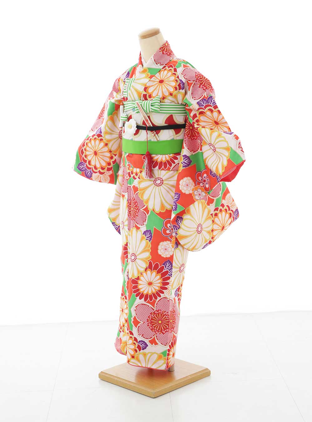 全面にカラフルで大きな花々が目を引く着物。大輪の花には赤・オレンジ・黄色・緑などの鮮やかな色合いが用いられ、見る人にポップで力強い印象を与えます。 大きな桜には絞り柄がデザインされており、気品や上品さも感じられます。帯揚げやしごきには着物に入っている緑色を使用して統一感を出しています。家族撮影でも目立つ色味なので主役らしさを演出できます。