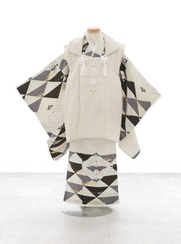 全体的にホワイトを基調としながら幾何学的なモノトーンの柄がアクセントになっていて、ブラックとグレーのひし形や三角形を組み合わせた大胆な模様でモダンな印象。それに淡いベージュのシンプルな被布コートを合わせた上品な1着。