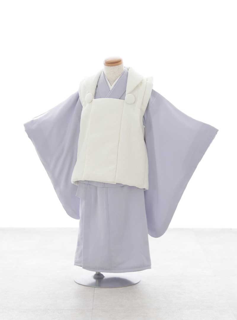 淡いラベンダーの着物に、白の被布を合わせた上品な1着。白と淡いラベンダーの組み合わせは爽やかで清潔感のある印象を与えます。 シンプルな配色だからこそ子供のあどけない表情や仕草がより引き立ちます。 被布タイプのため着付けもしやすく、初めての和装撮影にも安心してお選びいただけます。ご家族みんなで淡い着物でお揃いっぽくしてみてはいかがでしょうか。
