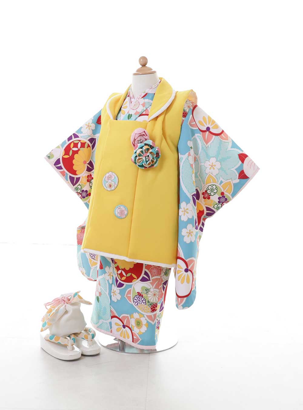 鮮やかな黄色の被布コートが目を引く着物です。着物は水色にカラフルな花模様があしらわれたデザインです。古典的な模様ですが、全体の鮮やかな色遣いがポップで子供の遊び心を忘れない雰囲気を感じられます。 被布コートについている花のモチーフは可愛らしい印象にも仕上げてくれます。子供らしい元気で明るい印象にしたい方にはオススメ。
