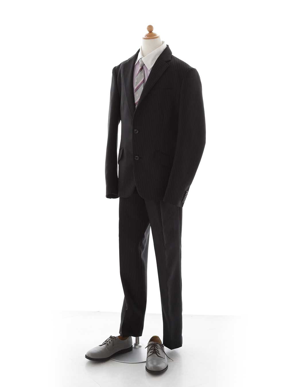 シンプルで洗練されたブラックのストライプ柄が特徴です。ジャケットはシャープなラインで、ホワイトのシャツと淡いパープルのストライプ柄ネクタイがアクセントを加えています。 全体的にフォーマルでクリーンな印象を持ち、卒業式や入学式などのイベントにぴったりの一着です。150cmサイズです。