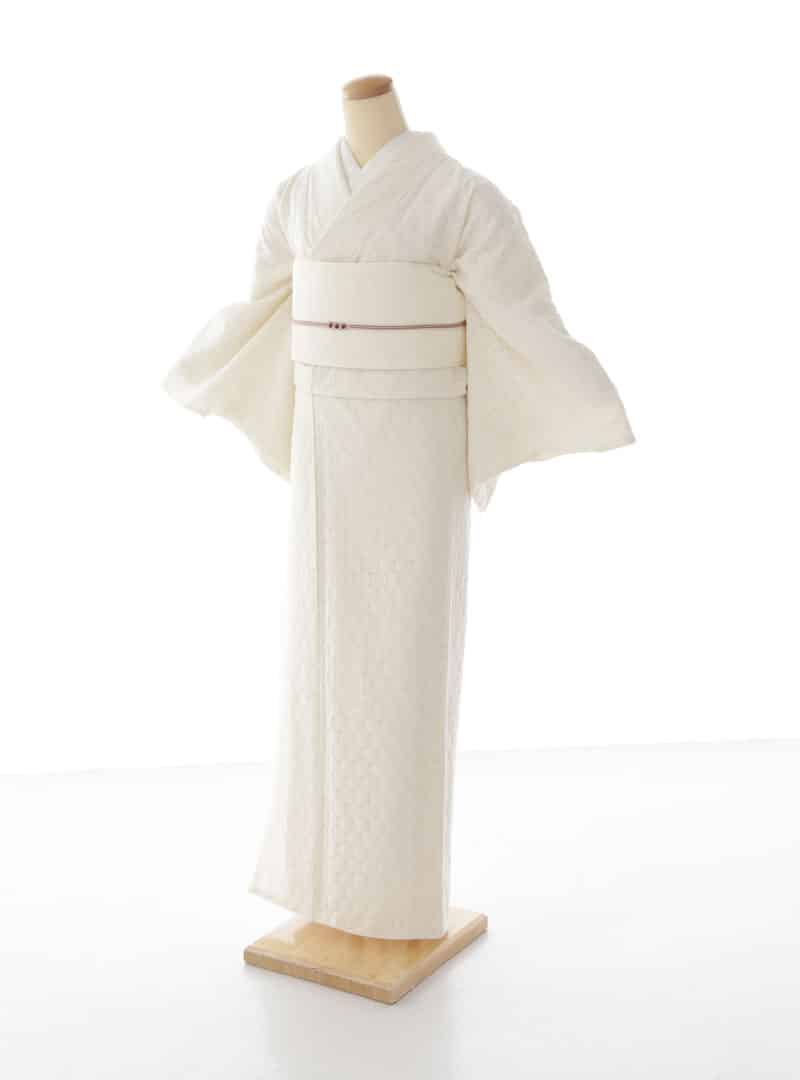 純白の色合いが持つ清楚で気品あふれる印象が特徴です。涼しげな柔らかい生地で、ドット柄が全体に広がり、現代的要素が詰まったお洒落な着物です。帯は同じトーンで合わせ、全体に調和をもたらし、大人の魅力を引き立てます。 白で統一されシンプルで落ち着いた雰囲気はお子様をより映えさせます。家族で淡色コーデを希望の方にオススメの一着です。