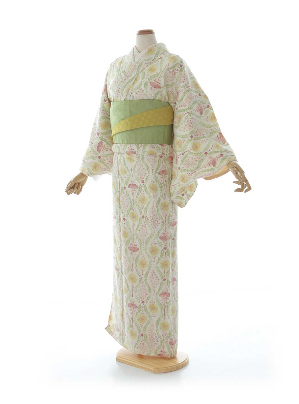 優美で繊細なデザインが施されたこの着物は、伝統的な美しさと現代的な感性が見事に融合しています。淡いクリーム色を基調とし、上品なピンクと柔らかなグリーンが織り成す模様は、自然の息吹を感じさせる植物や花々のモチーフとなっています。これらは四季の移ろいを感じさせながらも、清らかで優雅な印象を与えます。帯の柔らかなクリーム色が全体の調和を保ちつつ、繊細なアクセントとしてデザインを引き立てています。