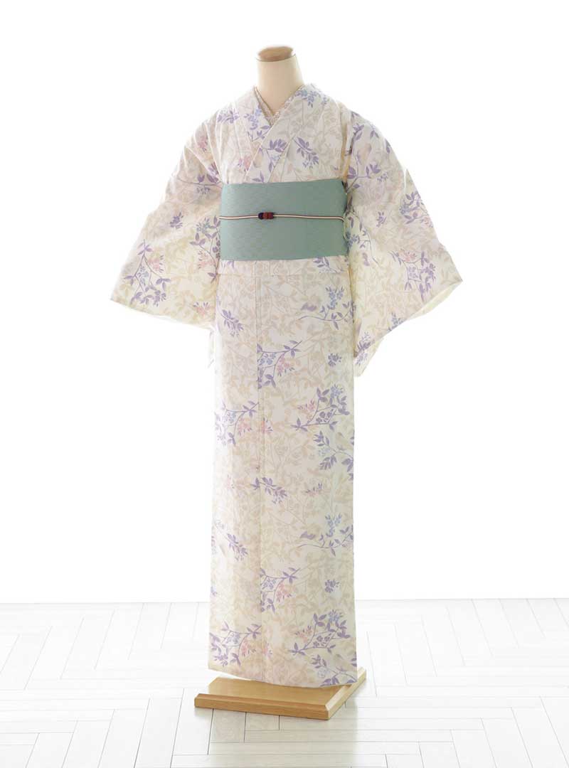 白地にピンクとむらさきの花が可愛らしい着物です。人気の淡い色味で揃えてのご家族撮影される方に選ばれており、スタジオエミュオリジナルの着物やナチュラルな淡い色味の着物を選んだお子様ととっても合います。 全体的に淡い色味でピンク、紫の色味が淡くふんわりとした優しい雰囲気に仕上げることができます。
