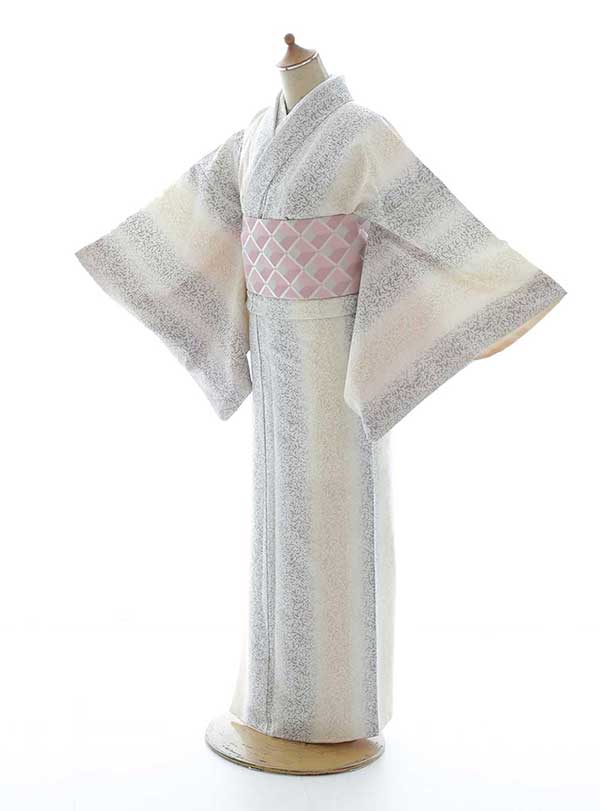 オフホワイトに銀鼠色の霞がかった上品なカジュアル着物。 落ち着いたトーンながらも霞の模様が華やかさを添え、洗練された雰囲気を演出します。総柄で豪華にしたいけど落ち着いたカジュアル着物が着たい方におすすめの一着です。 また、兄弟、家族の撮影も雰囲気合わせの着物で統一感のある撮影が可能です。
