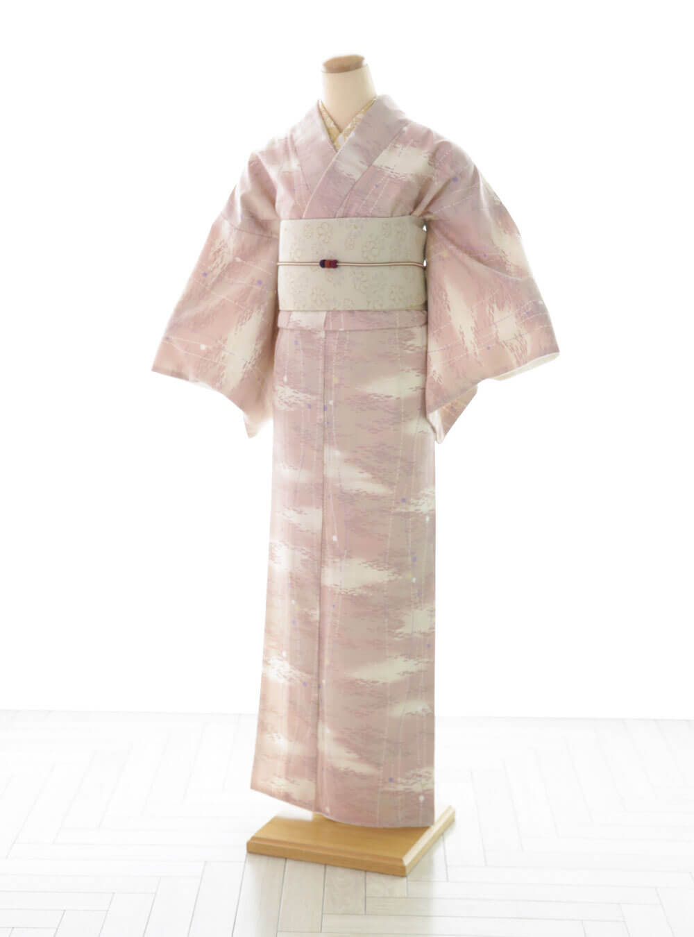 優しいピンクを基調とした色合いが特徴で、女性らしさと柔らかさを感じさせる一着です。繊細に描かれた雲のような柄が全体に広がり、まるで空に浮かぶ淡い雲のような幻想的な雰囲気を醸し出しています。 帯は落ち着いたベージュで、細やかな花柄が施されており、着物の色調と絶妙なバランスを保っています。ピンクの色味は肌を明るく見せ、優雅で上品な印象を与えます。