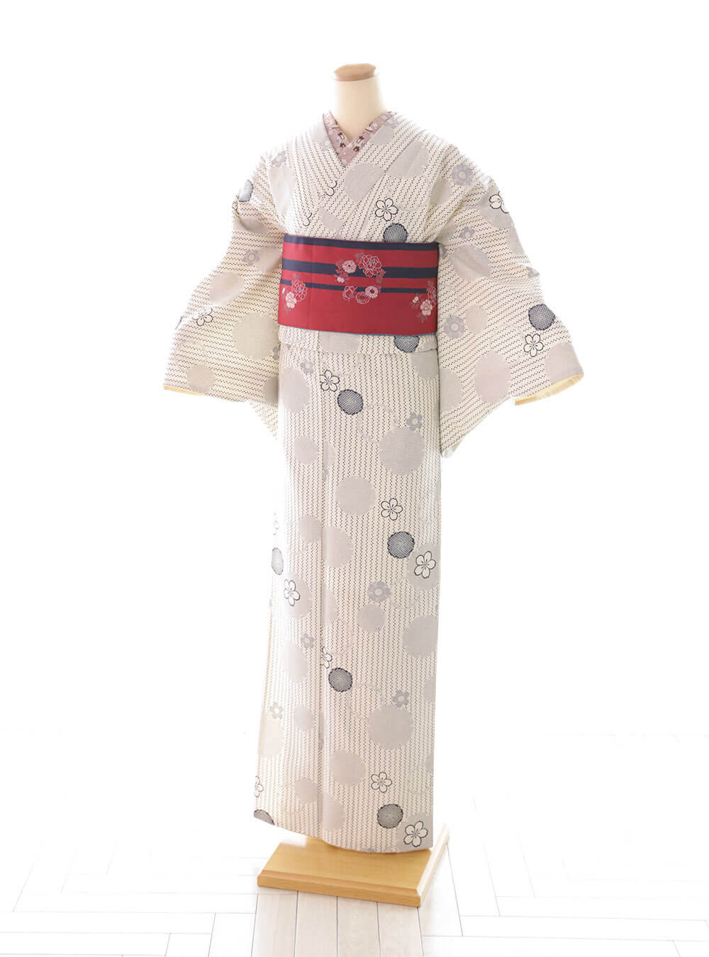白地を基調とした織り柄に、繊細な花と雪輪の模様が散りばめられ、控えめながらも上品な存在感を放ちます。赤い帯が鮮やかなアクセントを添え、全体のバランスを引き締めます。 優雅さと伝統が見事に融合しており、和の美しさを存分に味わうことができます。白地がベースとなっているので、お子様の着物がどの色味でも馴染みやすいです。