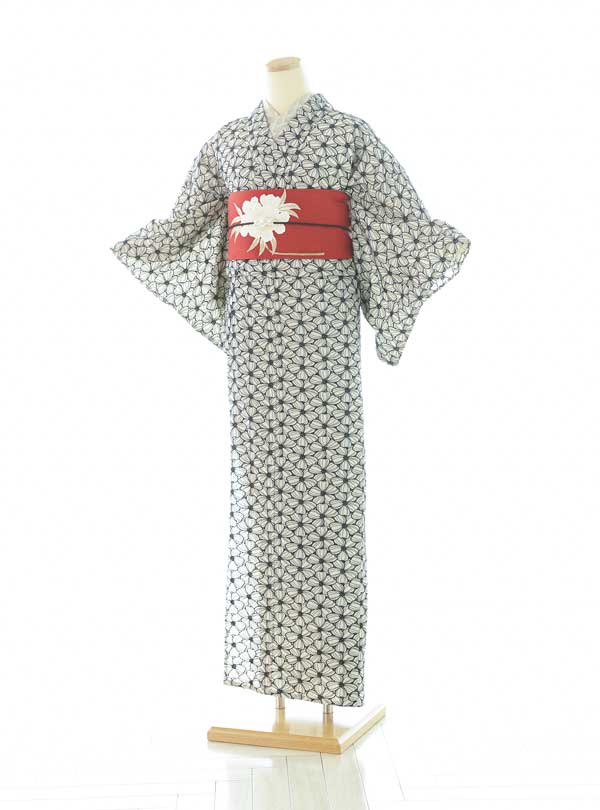 洗練されたデザインと上品さが特徴の美しい一枚です。白と黒のモダンな模様が全体にあしらわれており、伝統的かつ現代的なスタイルを見事に融合させています。目を引く深紅の帯が華やかさを演出し、中央には白の大胆な花のモチーフが施されています。 帯のアクセントにより、全体のバランスを調和してくれ、美しさを引き立てます。
