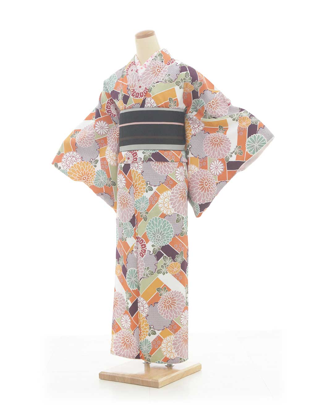 オレンジ、むらさきがメインカラーの着物です。 着物のレトロな柄はオレンジや紫、黄緑など明るい色味が使われておりとても華やかで、大きな菊のお花がとても可愛らしい印象です。 デザインは大正ロマンを感じられ、レトロでモダンな雰囲気が好きな方や、お子様がモダン柄や明るい色味を選ばれた方におすすめです。
