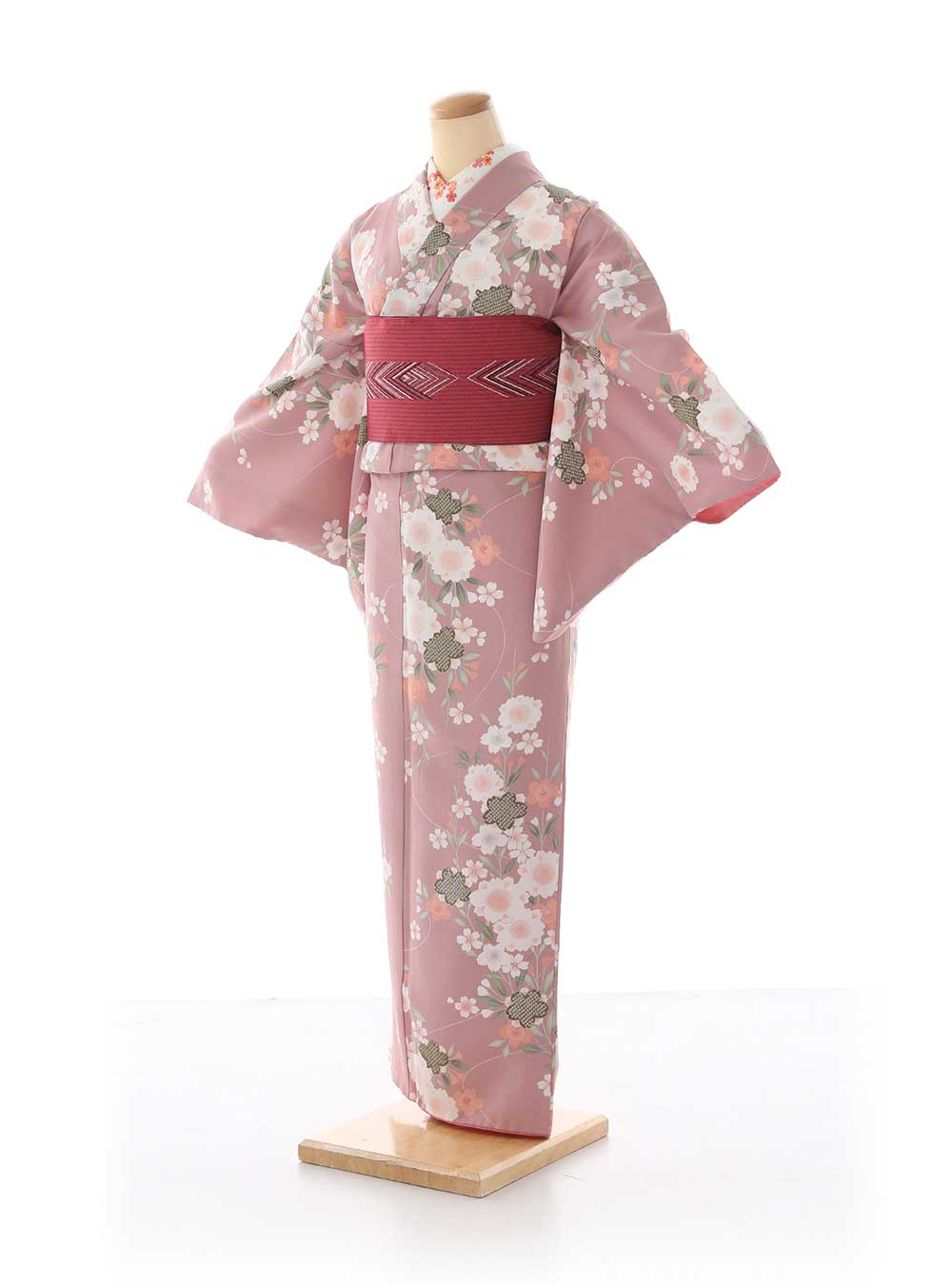 ピンクや白の桜がデザインされており色味も淡く可愛らしい雰囲気です。 着物全体に柄がデザインされているのでとても華やかで七五三などのお祝い事にはぴったりです。濃いピンクの帯が全体をぎゅっと引き締めてくれており女性らしさも感じられます。 どんな色味の着物とも合わせやすいのも人気のポイントです。