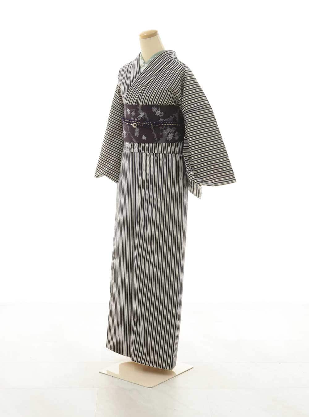 シンプルな縞模様が特徴のカジュアル着物です。 細かいストライプが全体に施されており、すっきりした印象を与えながらもさりげないモダンな雰囲気にしてくれます。モノトーンの配色が落ち着きと上品な印象を持ち、どの世代の方にも人気な一着です。 可愛すぎずシンプルなカジュアル着物がご希望の方におすすめです。