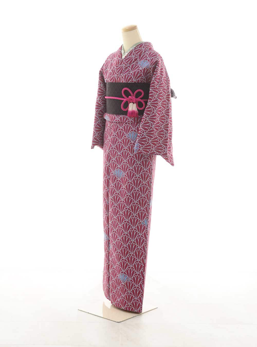 上品な赤みのカジュアル着物。 着物全体には扇のように広がる幾何学模様が大小交互に並び奥行を感じさせ、目を引く柄になっています。落ち着いた色合いと古典柄が調和し上品で華やかな印象にしてくれます。所々に水色が入る事でアクセントになり、レトロモダンな柄で、カジュアル着物には珍しい総柄です。
