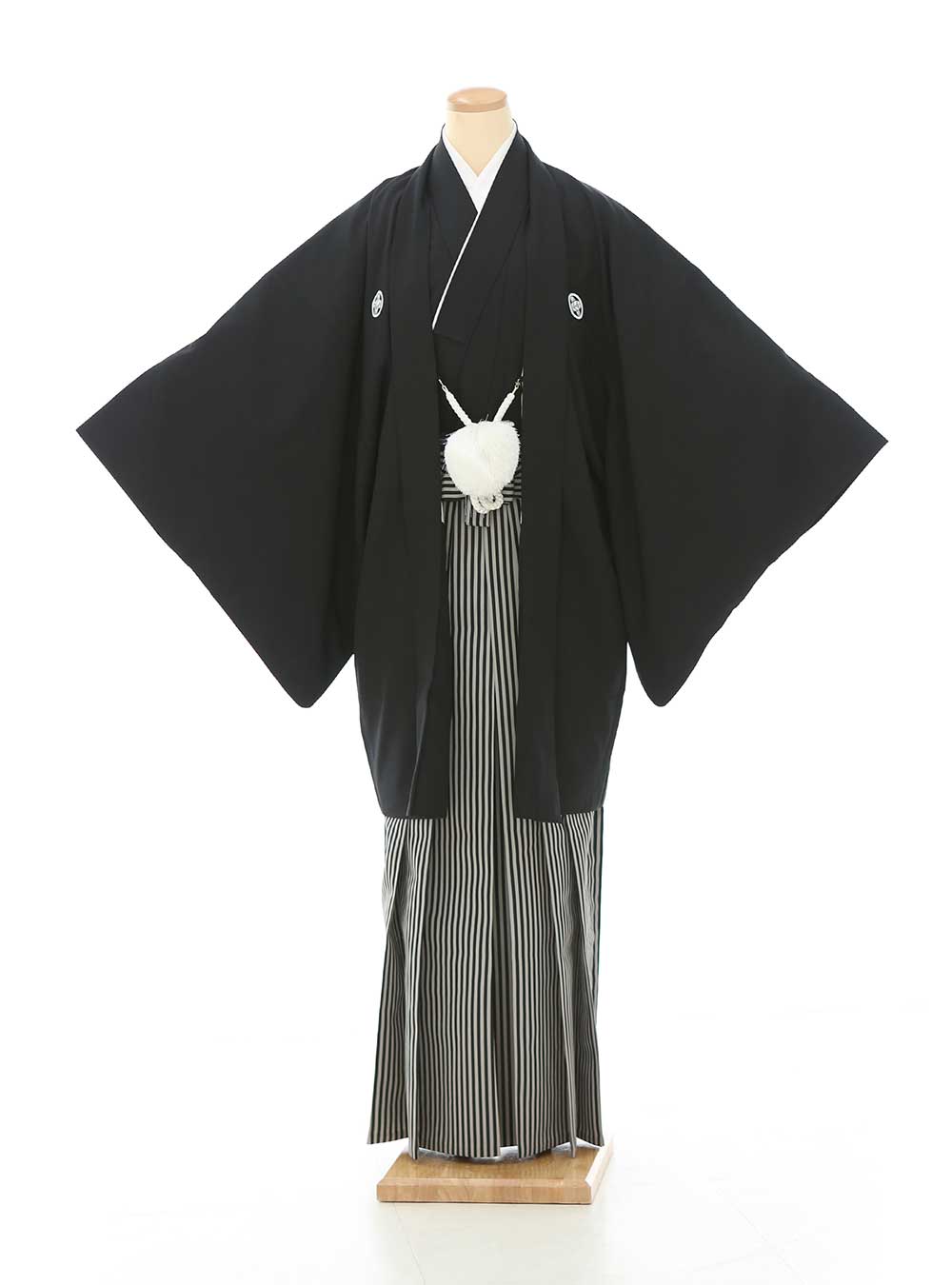黒の羽織に白とグレーの縞模様の袴を合わせた、男性用の伝統的な和装です。黒の羽織には家紋が入っており、格式と品格を感じさせるデザインです。袴の縞模様が全体にメリハリをつけ、洗練された雰囲気を演出しています。シンプルながらも威厳と落ち着きを兼ね備えた1着で、特別な行事にふさわしい装いとなっています。適応サイズは165㎝~178㎝です。