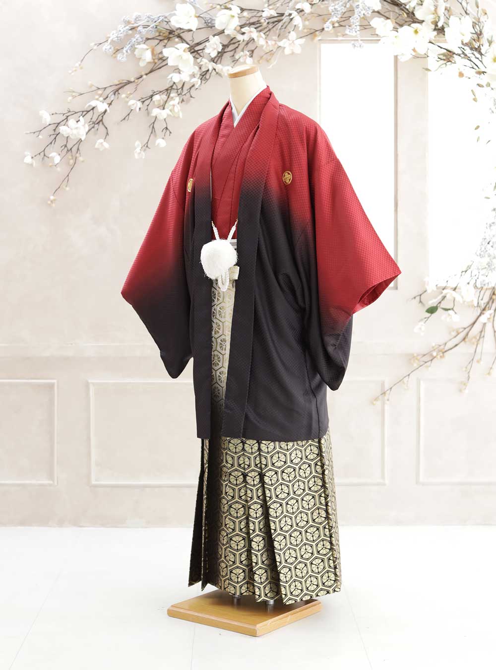 赤色は、活動的、情熱的、感情的なイメージを持ち、アグレッシブな強いエネルギーを感じる色。そこに黒をグラデーションで入れる事でシックな印象にも。さらに赤には古くから太陽の力の意味を持つ縁起のいい色なので、晴れの場にぴったりの一着です。とにかく華やかに!お写真映えしたい!そんな方には赤色の羽織袴で決まり♪