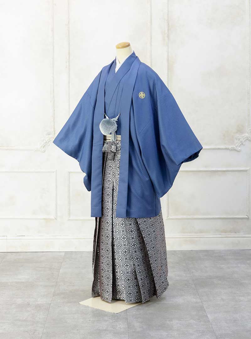爽やかなブルーの羽織に黒色の細かい幾何学模様が入った袴をコーディネートした羽織袴です。 鮮やかなブルーに黒色の柄が入った袴を合わせることで落ち着きのある大人っぽい印象にしてくれます。着物には地紋が入っておりシンプルでありながらも上品で、シックな雰囲気も演出してくれる着物です。