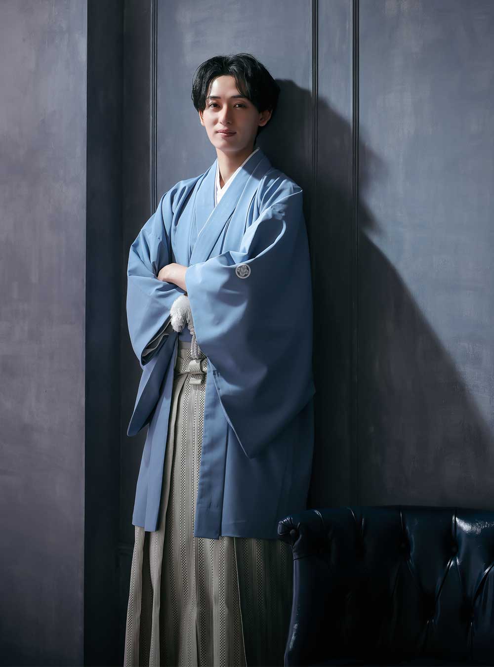 格式高い和装の伝統と現代のモダンなスタイルが見事に合わさった一着です。羽織の落ち着いた青色は知性と穏やかさを演出し、グレーの袴との組み合わせは上品さと洗練された印象を与えてくれます。この色合いの羽織袴は凛とした風格を与えてくれ、クールで大人な雰囲気を纏うことができます。袴の流れるようなラインと羽織の落ち着いたトーンが上品なアクセントを加え、全体を引き締めています。