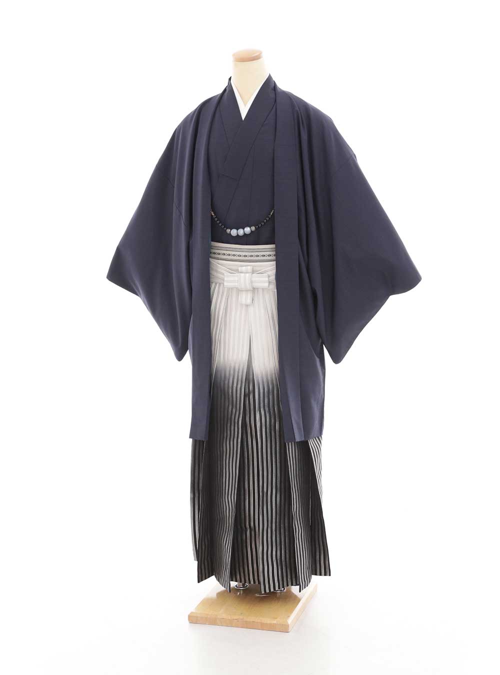 深い藍色の羽織に、白と黒のグラデーションが美しい縞模様の袴を組み合わせた男性用の和装です。羽織は落ち着いた藍色でシンプルながらも品格を感じさせ、袴のグラデーションが全体に動きと深みを加えています。シンプルな中に洗練されたデザインが光る1着で、伝統的な美しさと現代的な感覚を両立させた装いとなっています。適応サイズは170㎝~175㎝です。