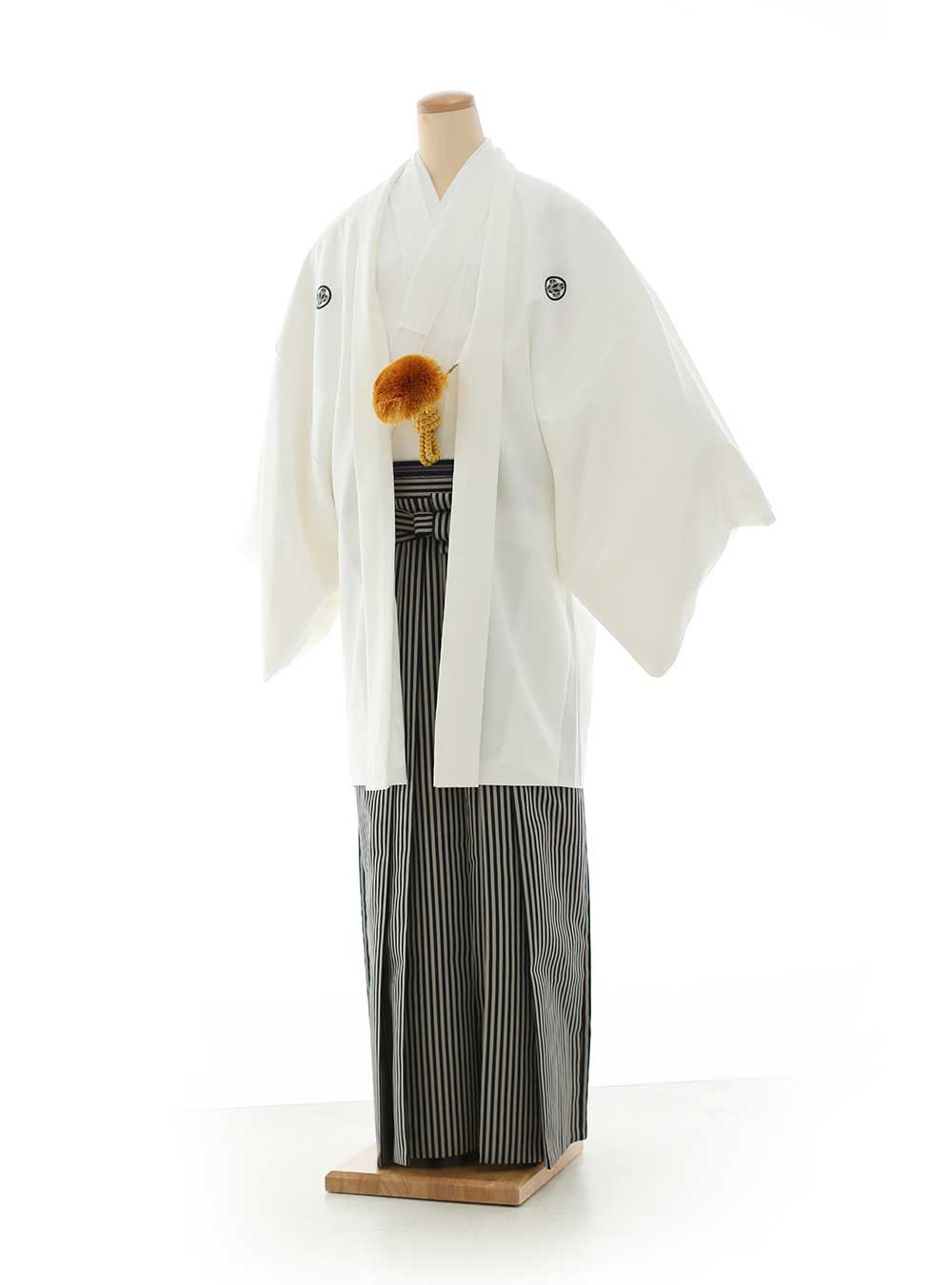 白の羽織に黒と白の縞模様の袴を合わせた、男性用の伝統的な和装です。羽織は清潔感のある純白で、格式と品位を感じさせるデザインです。家紋が入っており、特別な場にふさわしい重厚感を持っています。袴の縞模様が全体にメリハリをつけ、シンプルながらも洗練された印象を与える1着です。適応サイズは165㎝~170㎝です。