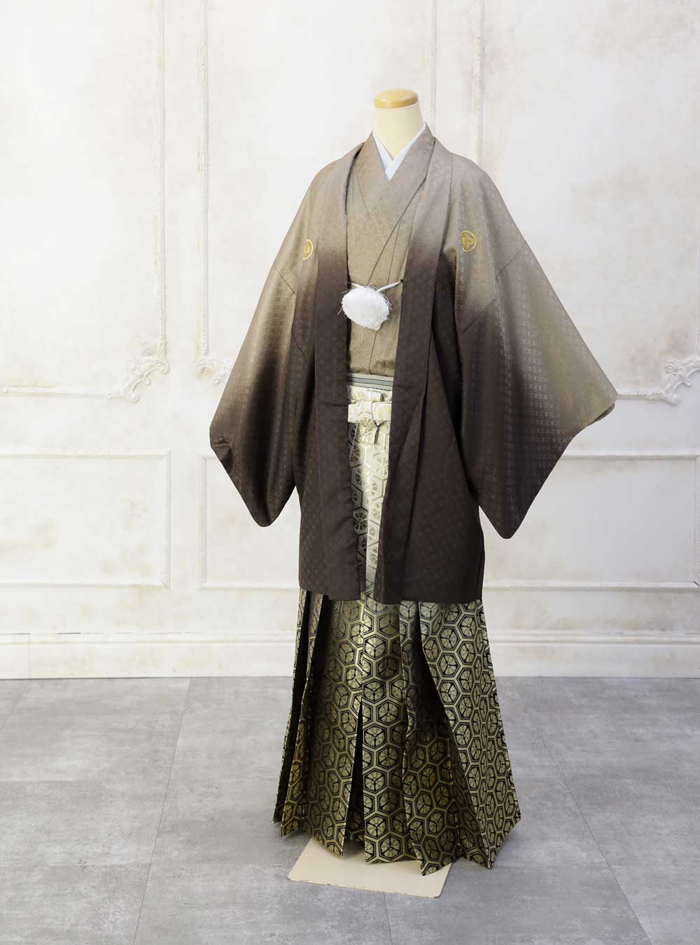 落ち着いたブランのグラデーションがきれいな袴にゴールドの亀甲柄の入った袴をコーディネートした羽織袴。 ゴールドの袴には亀甲柄に幾何学模様が施され、シックな中にも豪華さを添えています。羽織には無地ながらもグラデーションになっており、さらにラメが入っているため、落ち着きだけでなく華やかさも演出してくれます。