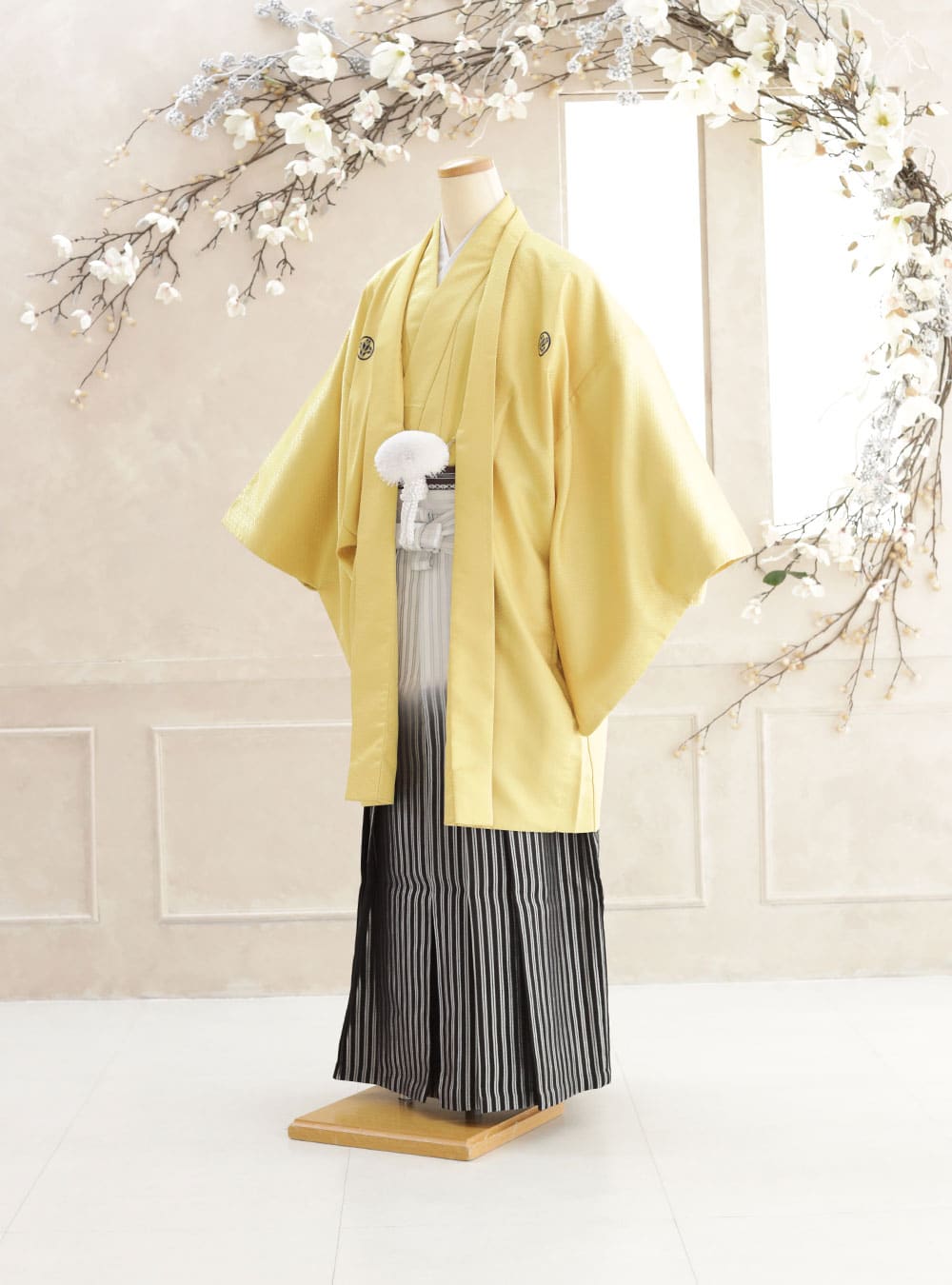 太陽の光を連想させるイエロー。古くから着物にも用いられていたカラー。この色は明るさや楽しさ・前向きな感情・幸福感を連想させるカラーです。 主役がしっかり目立ち、元気で明るい印象を与えたい方にはこちらの衣装がオススメ。花嫁様の明るいカラーの打掛に合わせるとより映えます。シンプルな背景がおすすめ。