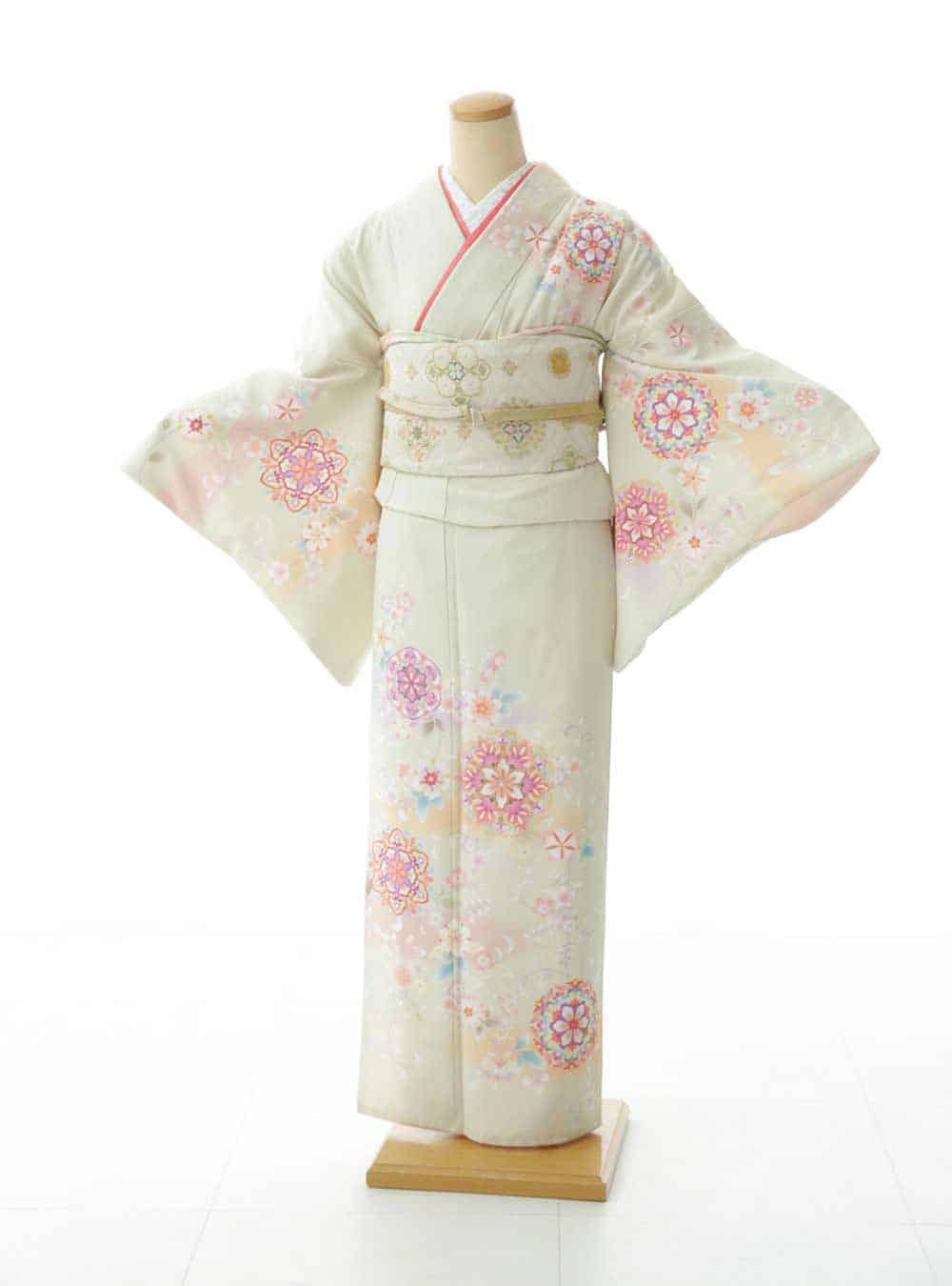 全体的に淡い色味で統一された、クリームベージュがメインカラーの着物です。着物の柄は唐花文になっており上品で女性らしいデザインです。色味は白やベージュでデザイン描かれているので統一感もあり、今流行りの淡色コーデでご家族撮影やお子様との撮影を希望の方にぴったりの着物です。 落ち着いた雰囲気で華やかな印象なので入学式や成人式、お宮参りなどのお祝い事にはぴったりの衣装です。