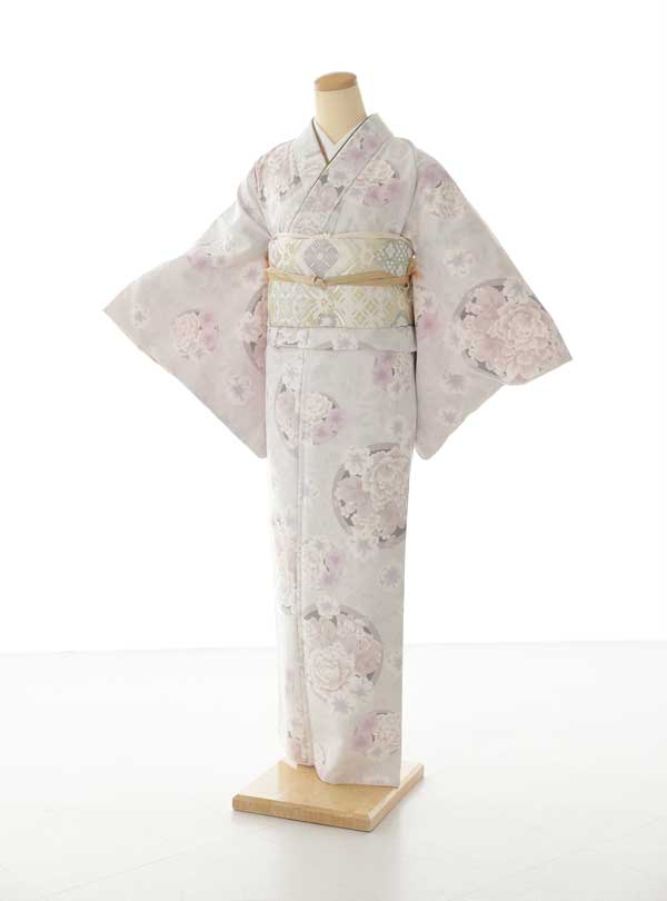 全体的に淡くふんわり優しい雰囲気の着物です。淡い紫の地色の着物に大きな牡丹の花がデザインされておりとても女性らしさを感じられます。紫やピンクのお花が着物全体に散りばめられており可愛らしく華やかな雰囲気です 全体的に淡く柔らかい印象なので若々しさを感じさせてくれる着物です。