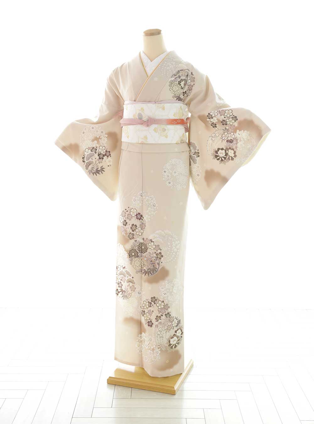 エレガントで上品な雰囲気を持つ一枚です。柔らかなベージュの地色に繊細な花柄が描かれています。優雅な牡丹や桜の花々が丁寧に描かれており、淡いピンクの帯締めや金色の色使いが全体に落ち着きと華やかさを与えます。 帯はシンプルながらも洗練されたデザインで全体のバランスを整え、エレガントさを際立たせます。