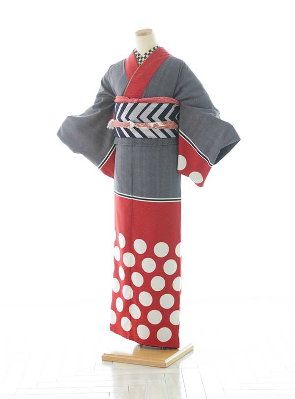 モダンで個性的なデザインが魅力の一枚です。グレーと赤のカラーコンビネーションが特別な日の装いに最適です。鮮やかな赤色に大きな白いドット模様が施されており、大胆なデザインがモダンで個性的な印象を与えます。 シックなグレーが締め色としての役割を果たしており、華やかさのなかにも上品なで落ち着いた印象を与えます。