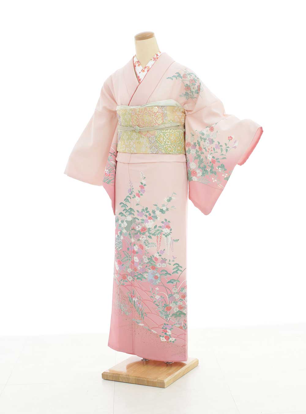 淡いピンクが可愛らしく古典柄のデザインがとても上品な着物です。ピンク地色は淡く優しい色味で裾になるにつれ濃いピンクにグラデーションになっているのが特徴的です。柄には藤や桜、菊、紅葉など伝統柄がデザインされています。 色味も水色や緑、紫などが使われているのでとても華やかな印象です。入学式や成人式、お宮参りなどお子様のお祝い事にはぴったりの衣装です。