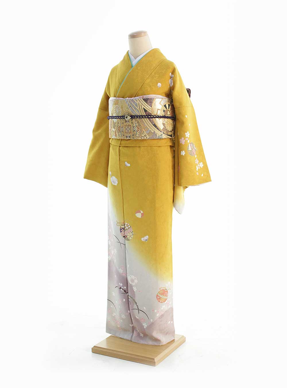 芥子色から白とピンクに裾にかけて広がるグラデーションがきれいな訪問着。 裾に咲く桜と鞠の柄が、可愛らしさを添え、上品で華やかな印象を与えます。 桜には、繁栄や豊かさ、豊穣といった意味を持つ柄で、どの世代からも人気のある柄で、華やかな色合いが表情を明るく見せてくれます。