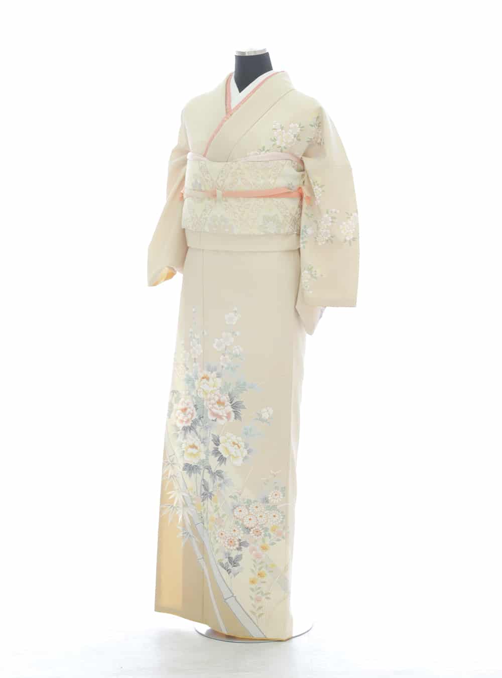 淡いベージュ地に牡丹、菊、竹といった花々が描かれた訪問着。 繊細な色彩と格調高い古典柄が落ち着きのある上品な雰囲気にしてくれます。訪問着には珍しい大きく広がる花柄が、落ち着きの中に華やかさのある魅力的な一着です。 昔ながらの古典柄すぎず、現代的すぎないデザインでどの世代にも人気の着物です。