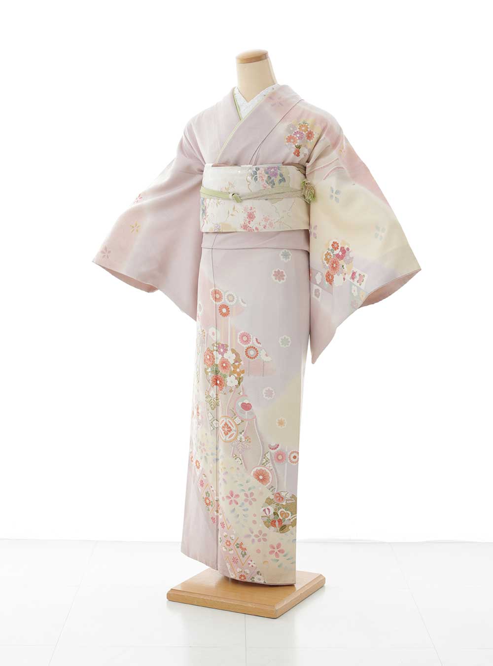 ややくすんだ淡いピンク色を基調とした衣装。くすんだピンク色は落ち着いた印象があり、桜や菊などの色彩豊かな花模様は華やかさと春らしい柔らかい印象を与える1着。 訪問着の象徴である肩から袖・裾にかけて流れるようなデザインが特徴的です。可愛らしい色味がお好みの方・落ち着きのある上品な雰囲気をお好みの方にオススメ。