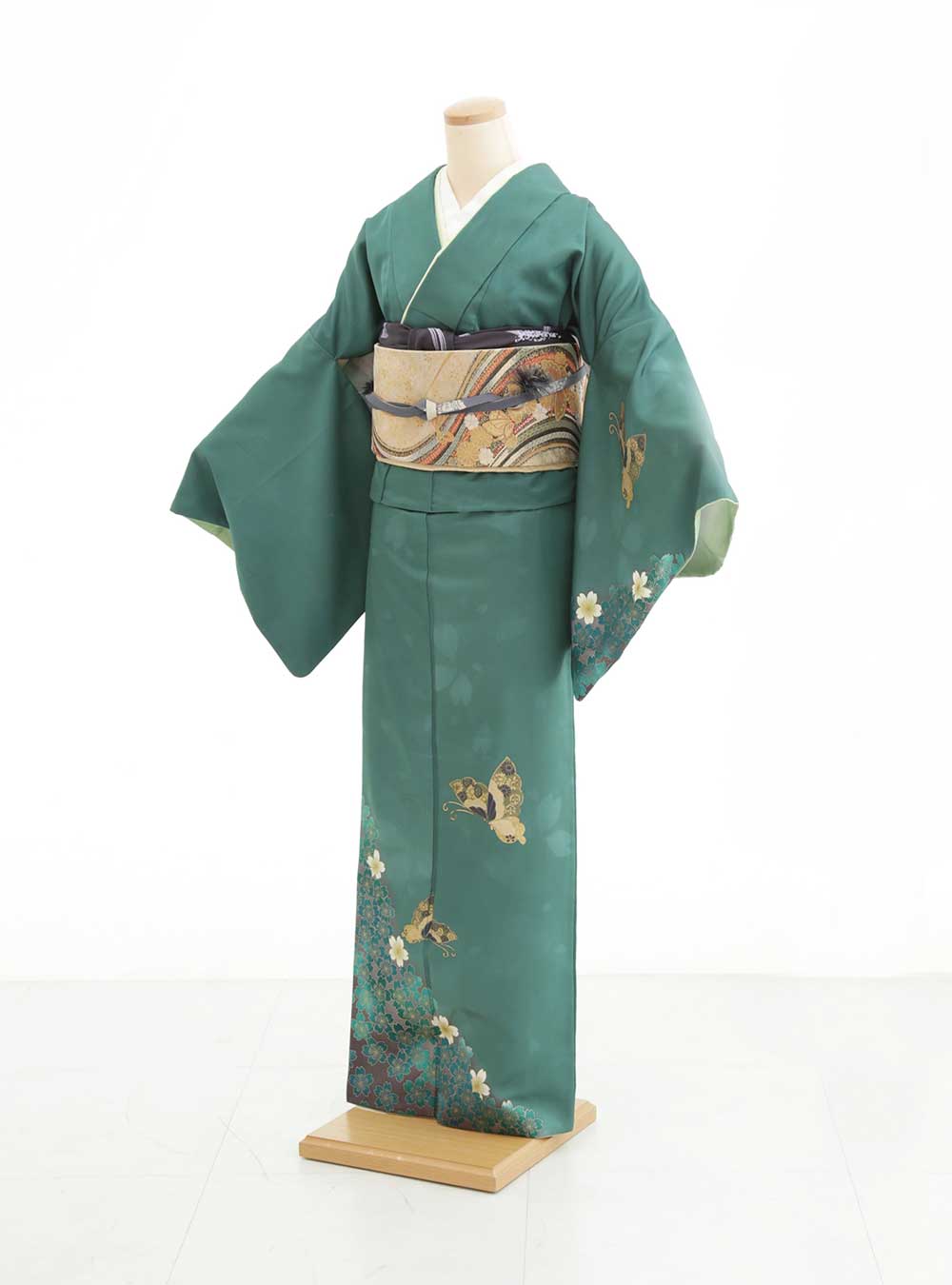 深い緑色を基調とした落ち着いた印象のある衣装。裾の花柄のモチーフがさりげなく濃い色へのグラデーションになっているのが上品な印象に。 袖や裾に蝶の模様が描かれているのもこの着物のワンポイントに!光沢のある生地にゴールドの蝶が上品さを際立たせてくれ、目を惹くこと間違いなし!シックな印象のあるこの衣装は、年代問わず着こなせる1着。
