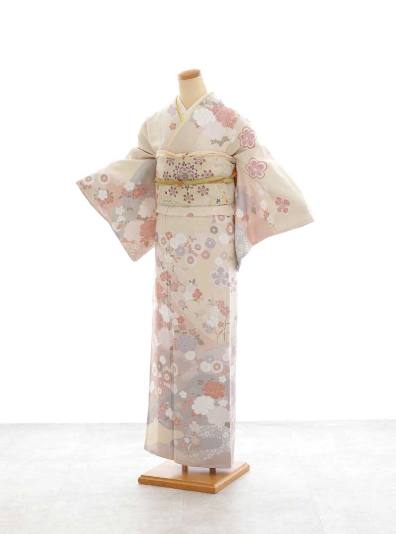 柔らかなクリーム色が基調となり、女性らしさと優雅さを引き立てる1着です。細やかに描かれた花々が柔らかな印象を与えます。帯のデザインもまた優しい色合いで全体を調和させ上品さを際立たせます。特別な日に彩りをプラスしてくれます。