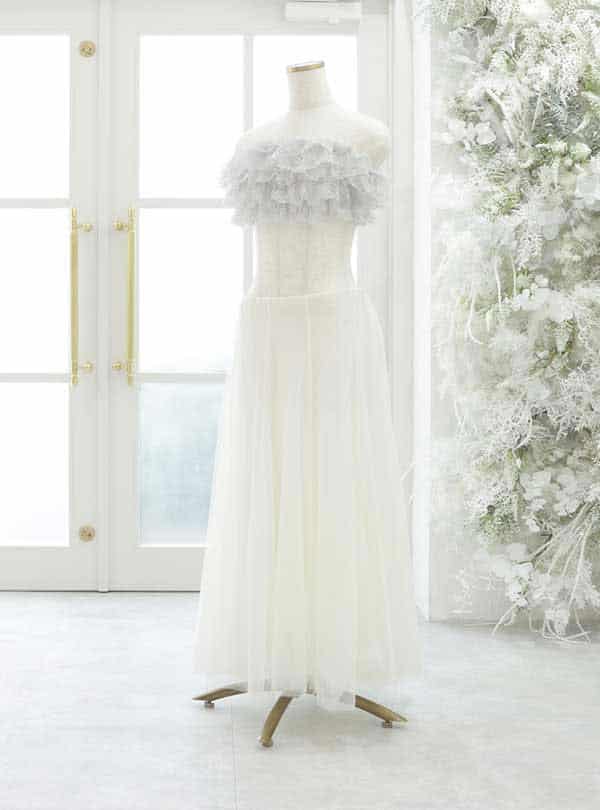 軽やかでフェミニンなデザインが特徴です。トップス部分にはふんわりとしたグレーのフリルがあしらわれており、肩からデコルテにかけてエレガントな雰囲気を演出します。シンプルでありながらもディテールにこだわったデザインが美しく、特別な写真をさらに華やかに彩ります。 スカート部分には繊細なホワイトチュールが使用され、上品で洗練されたマタニティ衣装です。
