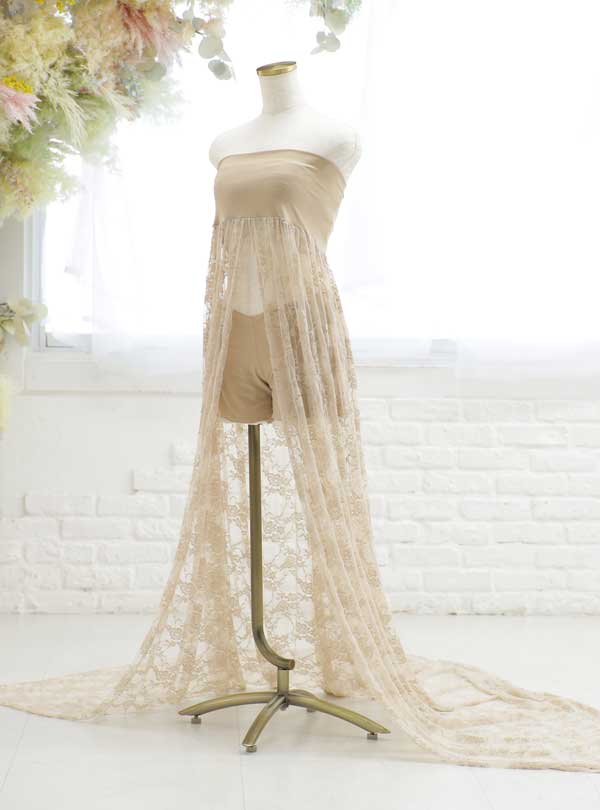 肌馴染みの良いベージュを使用したエレガントな衣装。トップスはシンプルなチューブトップで、スカート部分には透け感のあるレースが使用されており、柔らかく流れるようなシルエットが女性らしさを演出します。 ロングトレーンで後ろ姿まで美しく魅せてくれる1着。王道の白ドレスよりも大人っぽい印象に仕上がります。