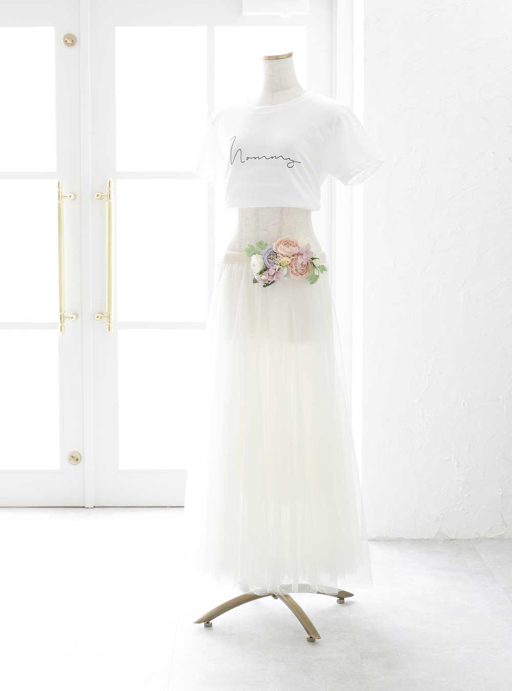 カジュアルとエレガントを絶妙に融合させた一着です。白のTシャツには「Mommy」のシンプルでスタイリッシュなロゴが施されており、リラックスした雰囲気を演出。一方でウエスト部分には華やかなフラワーサッシュベルトを付けることで、柔らかいチュールスカートが優雅に広がります。 「Daddy」のロゴ入りTシャツもご用意しており、パパとTシャツコーデも可能です。