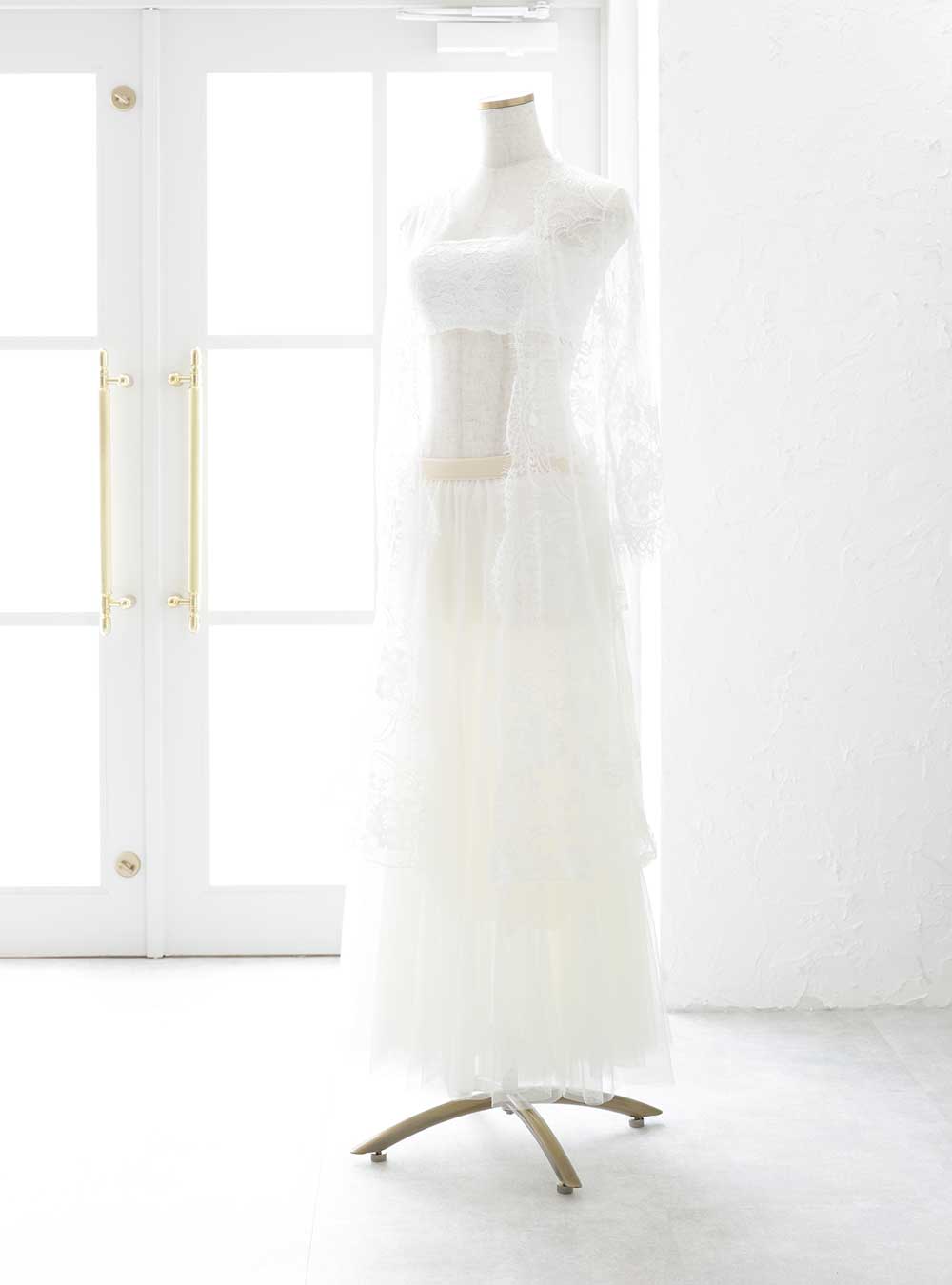 中のチューブトップレース素材を使用しており美しさを一層引き立てます。上からレースの上着を羽織ることで、女性らしい優美さを演出します。また腕元カバーにもなるので、腕をあまり出したくない方にもオススメです。 下はホワイトチュールスカートを合わせることで、全体の色味の統一感も出て爽やかな印象を与えます。