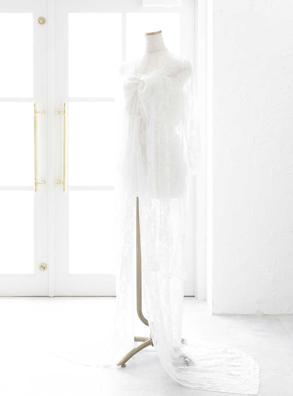 優美で洗練されたデザインが特徴です。軽やかなレースが全体を包み込み、シンプルでありながらも女性らしさを引き立てます。胸元のノットデザインがアクセントとなり華やかさを演出します。 レースの上着はより美しさを強調し、また腕元カバーにもなります。足元にレースがかかることで、程よい透け感がマタニティらしいお洒落な雰囲気に仕上げます。