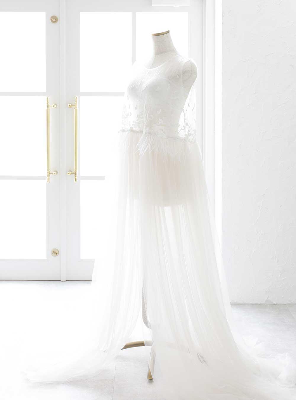 繊細なレースと軽やかなチュール素材が優美に融合したデザインが魅力です。透け感のあるトップスに施された刺繡は、女性らしさを引き立て上品でフェミニンな印象を与えます。お腹の部分にスリットが入っており、お腹のラインを綺麗に出して撮影することができます。 中央の羽のフリンジが特徴的で、ふんわりとした柔らかい雰囲気が感じられます。