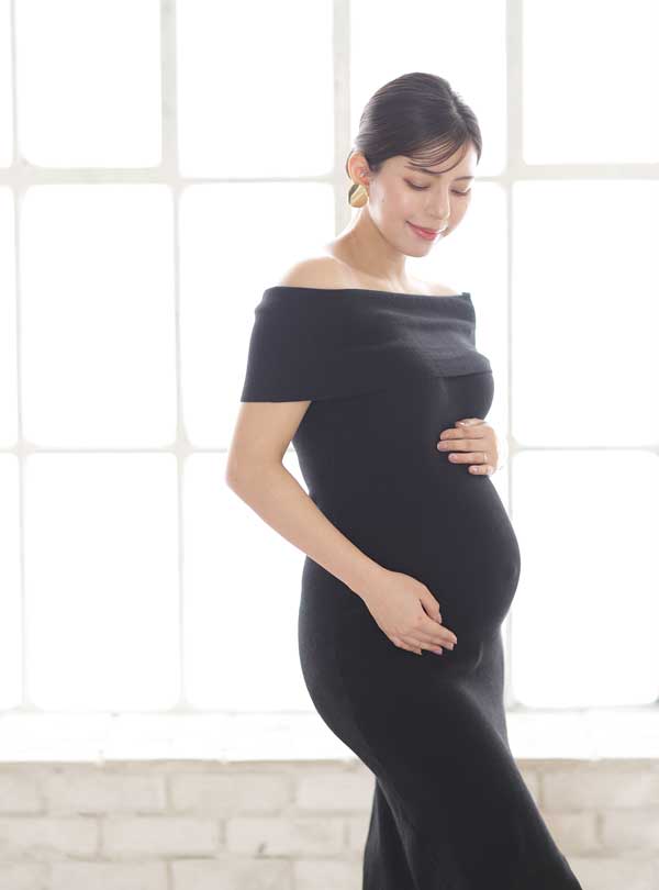 シンプルでありながらエレガントなデザインが特徴です。クラシックなブラックカラーが洗練された美しさを引き立てます。 オフショルダーのデザインが肩とデコルテラインを美しく見せ、女性らしさを際立たせます。タイトなシルエットが妊娠中の美しいボディラインを引き立て、エレガントでモダンな印象を与えます。シンプルなブラックの色合いが全体に落ち着きと高級感を醸し出しています。