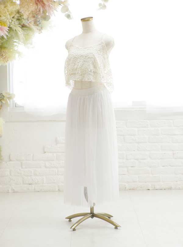 キャミソールトップスがスタイリッシュかつ上品さのある衣装。トップスは繊細なレースを使用したデザインで、キャミソール+胸元に深めに入ったカットでデコルテに抜け感を演出し顔や首回りがすっきりシャープに見えるのも特徴。 スカートはシンプルな白のフレアタイプで女性らしさのあるシルエットに。スタイリッシュな雰囲気・シンプルがお好みの方にオススメの1着。
